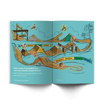 Our Shred Til Bed MTB Activity Pack is the ultimate indoor experience for your mountain bike kid, and is designed for children 3 years and older. Slopestyle sticker comps, trail mazes + a range of MTB-themed activities will keep your kid busy when they can’t get out and shred the singletrack.