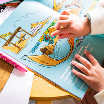 For kids 3+ years, with tantrum saving touches, like our lie-flat pages.
